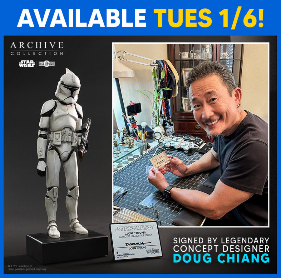 Teased at San Diego Comic Con, our Clone Trooper Concept Maquette Replica will be available TUESDAY 1/6 in a limited, timed edition that will be available for just SIX DAYS. We’re thrilled to announce this edition will be signed by legendary concept artist and Concept Design Supervisor for Attack of the Clones, Doug Chiang!